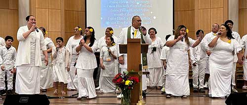 “The congregation, made up of Samoans and others, are drawn because most of the worship and sermons are in English, guided by the Spirit. Who’s counting!” he said with a smile. “I’m here to minister to them and sing with them.”