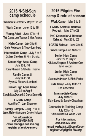 Register for camps and reatreats at n-sid-sen.org or pilgrim-firs.org.